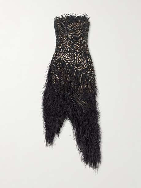 OSCAR DE LA RENTA فستان قصير بدون حمالات من نسيج شبكي مزين بحواف من الريش