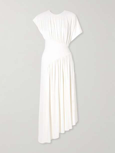 RABANNE فستان متوسط الطول بتأثير درابيه وبقصة غير متماثلة من الكريب المطّاط