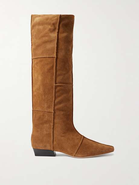 تقوم علامة STAUD بتحديث تصميم بوت 'Wally' بتزويده بدرزات بارزة ليبدو مصمماً من قطع قماشية متعددة. صُنع من جلد السويد بطول يصل إلى الركبتين ويستقر على كعب كوبي بارتفاع 45 مم ليمنحكِ طولاً إضافياً.