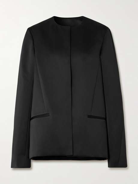يجمع هذا الجاكيت من TOTEME بين الأناقة والرقي بأسلوب مثالي. صُنع من الساتان المُعاد تدويره باللون الأسود ويأتي بقصة رسمية مع تقويرة عنق من دون ياقة وتفاصيل درزات مائلة تمنحه لمسة انسيابية أنثوية وناعمة.