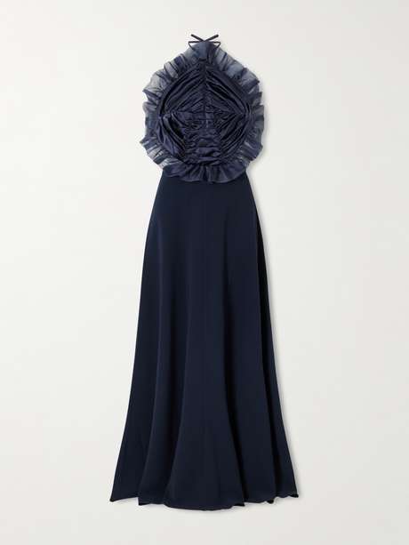 VIOLANTE NESSI فستان طويل بياقة هالتر الدائرية من ساتان حرير بكشاكش وظهر مفتوح وتأثير مزموم وحواف منا الأورغانزا
