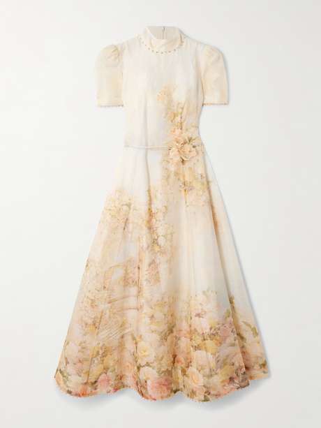 تُقدم علامة Zimmermann فستان 'Picnic' الذي يتميز بتصميمه الرائع والساحر، حيث يبدو وكأنه مستوحى من كتب القصص. صُنع من مزيج الحرير والكتان وزُين بورود رائعة، مع حزام لتحديد الخصر مزين بوردة ثلاثية الأبعاد وحبيبات خرز صغيرة الحجم على الحاشية الواسعة.
