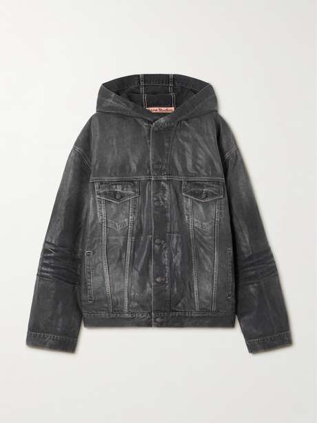 Diese Interpretation einer klassischen Bikerjacke stammt von Acne Studios und ist mit einer dezent glänzenden Beschichtung versehen. Das locker sitzende Modell aus Bio-Denim hat eine großzügig dimensionierte Kapuze sowie klassische Pattentaschen und wurde zudem an den Ärmeln in einer Art Knitteroptik gestaltet.