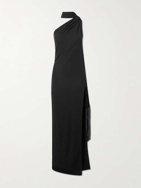 Die „Dassy” Robe war Teil der H/W 25-Laufstegshow von Acne Studios, welche 70er-Jahre-Flair verströmte. Das Modell aus Stretch-Strick hat eine lange, schalartige Partie mit Fransen, die elegant an der Rückseite herabfällt. Schuhe mit Stilettoabsatz passen besonders gut zum hoch geschlitzten Rock.