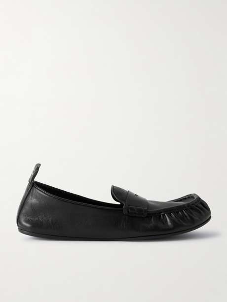 Als zeitgemäße Neuinterpretation des klassischen Loafers mit Penny-Schlitz bietet diese Version von Acne Studios reichlich Komfort. Das Paar aus etwas strukturiertem Leder ist an der karreeförmigen, abgerundeten Kappe dezent gerafft und dank der flachen Gummisohle recht leicht.