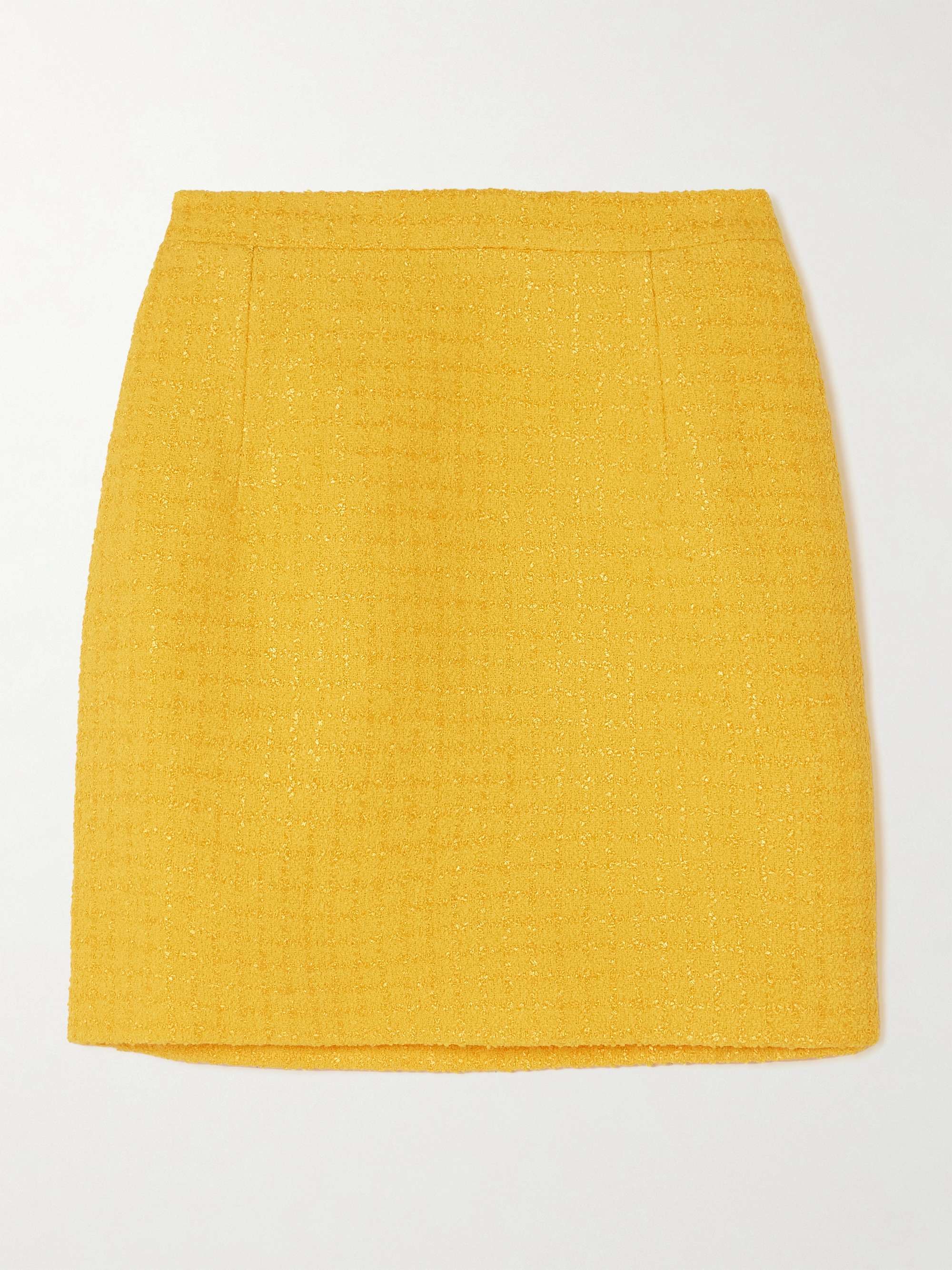 Dieser Minirock von Alessandra Rich bildet mit der passenden Jacke ein schickes Set, das an Kostüme der 80er-Jahre erinnert. Das Modell aus leuchtend-gelbem Bouclé-Tweed zeigt sich mit einem farblich harmonierenden Karomuster, das dezent schimmert.