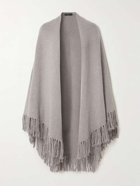 Dieser dicke, fließende Überwurf von Arch4 hüllt Sie locker in melierten Strick aus kuscheligem Kaschmir. Er wurde mit einem angedeuteten Schalkragen und langen Fransen abgerundet.