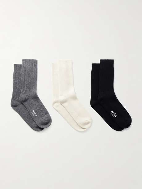 Das „Lucia“ Set von Arch4 wurde aus luxuriösem Kaschmir gefertigt, der sich durch seine ausgesprochen weiche Beschaffenheit auszeichnet. Es enthält drei Paar flexible Rippstricksocken in Schwarz, Creme sowie Grau und eignet sich perfekt als Geschenk.