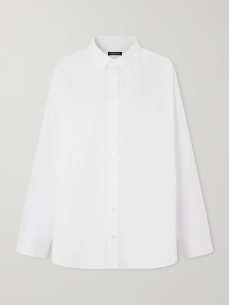 Dieses Hemd von Balenciaga unterscheidet sich durch eine seitliche Schnürung mit weit herabhängenden Bändern von klassischeren Varianten. Das Modell aus Baumwollpopeline sitzt leicht locker und wird mit glänzenden Perlmuttknöpfen geschlossen.