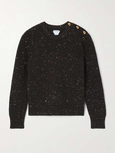 Dieser Pullover von Bottega Veneta wurde in Italien aus einer Wollmischung gefertigt, deren kontrastierende Garne für eine melierte Optik sorgen. Das Modell aus breit geripptem Strick hat im Schulterbereich drei der markentypischen goldglänzenden Knöpfe in Knotenform.