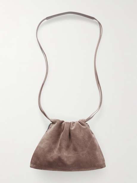 Die kunstfertig hergestellten Taschen von Brunello Cucinelli sind stets eine lohnende Investition. Dieses Modell wurde in Italien aus samtig-weichem Veloursleder gefertigt und mit den markentypischen Zierperlen versehen. Es bietet ausreichend Platz für Essentials wie Kartenetui, Schlüssel und Lippenstift.