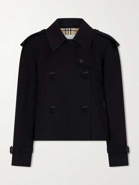 Diese Jacke von Burberry ist eine verkürzte Version des charakteristischen Trenchcoats des Hauses. Der Doppelreiher aus Baumwollgabardine verfügt an den Ärmelabschlüssen über die klassischen Schnallen. Ein kariertes Futter rundet das markentypische Design ab.