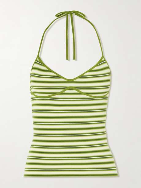 Das „Citara“ Neckholder-Oberteil von FAITHFULL verströmt Retro-Flair. Das Strickmodell aus einer Baumwollmischung hat einen schmalen Schnitt und zeigt sich mit Streifen, dank derer dezente Farbverläufe entstehen. Es gefällt uns in Kombination mit den passenden „Playa“ Shorts besonders gut.