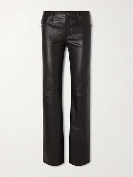 Die „Rodeo“ Hose von FRAME verdankt ihren Namen dem Bootcut-Bein im Western-Stil. Das schicke Modell aus überaus weichem schwarzem Leder harmoniert sowohl mit zeitgemäßen Cowboystiefeln als auch mit Ballerinas.