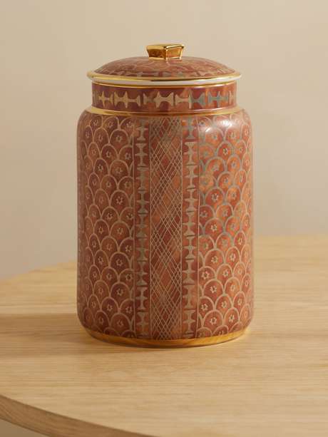 Die „Ashanti“ Dose von L'Objet stellt eine Hommage an die Arbeiten des spanischen Textildesigners Mariano Fortuny dar. Das Modell besteht aus natürlichem Ton und ist mit handgearbeiteten Akzenten aus 24-karätigem Gold versehen. Präsentieren Sie es auf einem Barwagen oder Regal.
