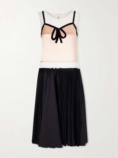 Dieses Midikleid von Marni bleibt dem innovativen Designansatz der Marke treu, indem es mit Proportionen und Lagen spielt. Es besteht aus verschiedenen Satinpartien und zeichnet sich durch eine samtene Schleife mit Trompe-l'Œil-Effekt aus. Das Material des in Falten gelegten Rocks wurde umgedreht, woraus sich der Kontrast zwischen der matten und glänzenden Seite ergibt.