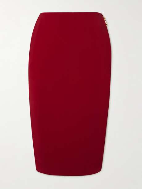 Bleistiftröcke sind ein zentrales Thema der H/W 25-Saison und waren Teil von vielen Looks der Laufstegshow von SAINT LAURENT. Dieses körpernahe Midimodell aus Grain de Poudre zeigt sich am Zipper mit dem „Cassandre“-Logo und reicht bis zu den Knien. Uns gefällt dabei besonders gut, dass es auch Taschen hat.