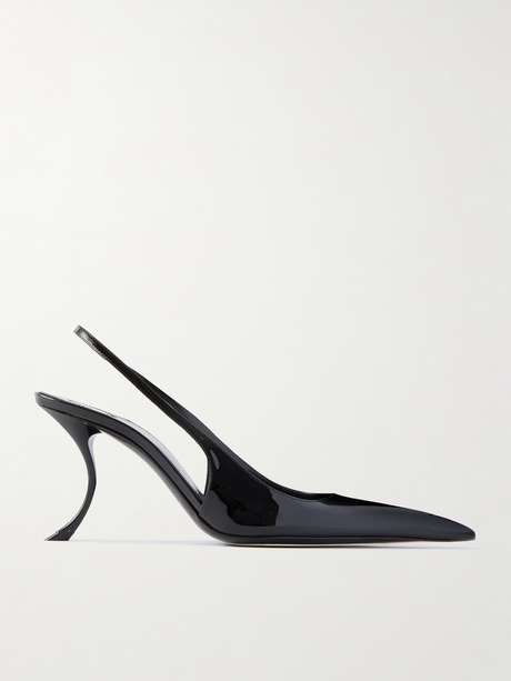 An den „Apolline“ Pumps von SAINT LAURENT fasziniert vor allem der kunstvoll gebogene, 85 Millimeter hohe Absatz, weshalb wir zu verkürzten Hosen oder Midiröcken raten. Das in Italien gefertigte Modell besteht aus glänzendem Lackleder und zeigt sich zudem mit einer markant verlängerten, karreeförmigen Kappe sowie einem elastischen Slingback-Riemen.