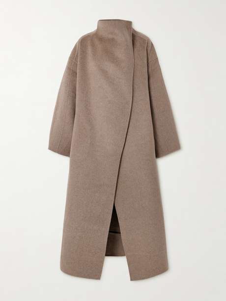 Der „Leroy“ Oversized-Mantel von The Frankie Shop besteht aus einer melierten, gebürsteten Wollmischung in einem gedämpften Graubraunton. Er wurde neben überschnittenen Schultern und bauschigen Ärmeln auch mit einem legeren Kragen gestaltet. Letzterer lässt sich nach Wunsch in einen Stehkragen verwandeln.