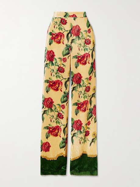Die Pre-Spring-Kollektion 2026 von Valentino Garavani zeichnet sich durch wunderschöne Vintage-Blumenmuster aus. Diese hoch sitzende Hose mit geradem Bein besteht aus Samt mit einer floralen Variante jener und reicht bis zum Boden. Stecken Sie eine Bluse in den Bund und tragen Sie High Heels dazu.