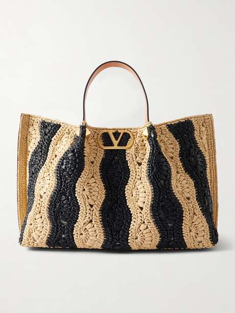 Die zweifarbige „VLogo“ Tote von Valentino Garavani besteht aus geflochtenem Raffiabast und hat Henkel aus Leder. Im geräumigen Inneren finden eine Wasserflasche, ein Tablet, ein Badetuch sowie wahlweise auch der mitgelieferte Beutel für kleinere Utensilien Platz.