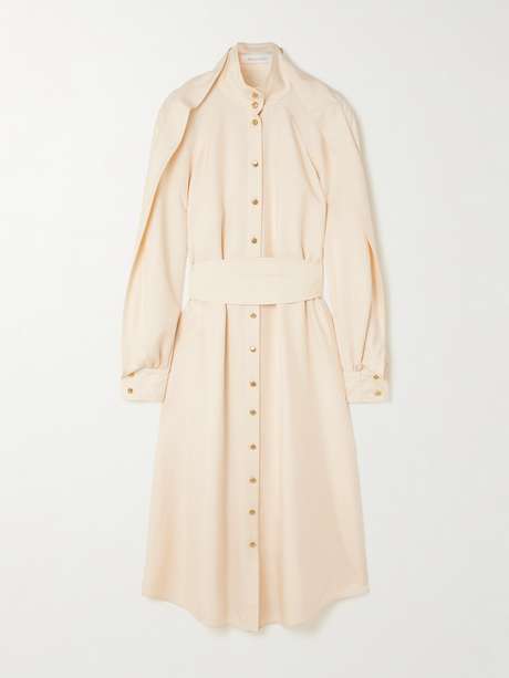 Das „Luna Obi“ Midikleid von Zimmermann wurde aus luftiger Seide in einem zarten Cremeton gestaltet. Das leicht lockere Modell hat zudem überschnittene Schultern und romantische Besätze an den Ärmeln. In Kombination mit High Heels kommt es besonders schön zur Geltung.
