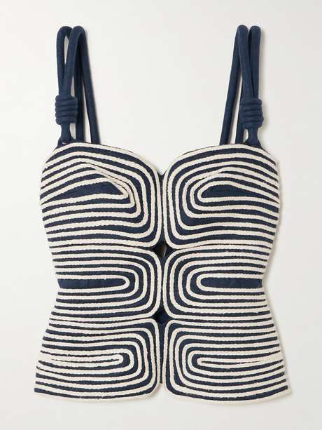Die seilartigen Stickereien am „Marea“ Oberteil von Andres Otalora sind tatsächlich eine Art Markenzeichen. Das Leinenmodell zeichnet sich zudem durch geknotete Träger sowie durch Cut-outs aus, die hier und dort etwas Haut durchblitzen lassen.