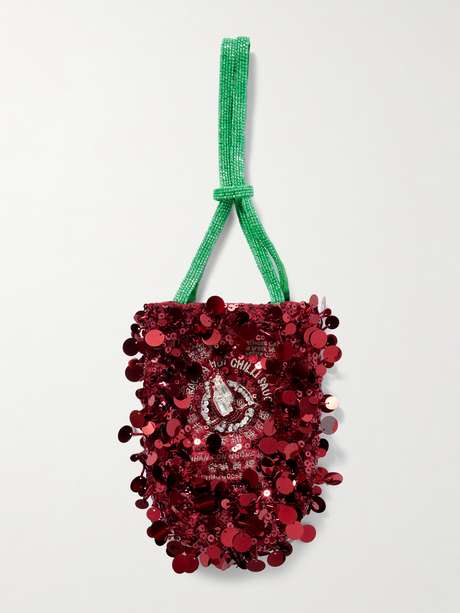 Diese Beuteltasche von Anya Hindmarch eignet sich zum Transport eines Kartenetuis sowie eines Lippenstifts, lässt aber noch Platz für ein Fläschchen Chilisauce – der Pailletten- und Zierperlenbesatz des Modells bildet speziell das Etikett der „Sriracha“ Variante von Flying Goose nach.