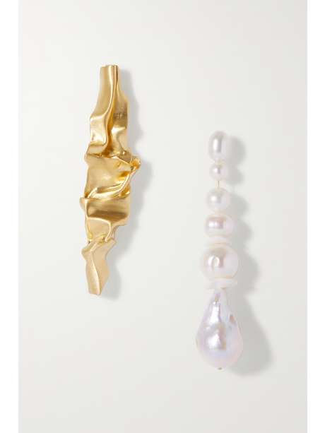 Ungleiche Ohrringe sind ausgesprochen angesagt und mit diesem skulpturalen Paar von Completedworks entsteht ein besonders cooler Look: Das wie gefaltet wirkende Modell besteht aus Gold-Vermeil, während sich das andere neben Barock- und Süßwasserperlen auch mit Keramikdetails zeigt. Damit das Duo nicht verdeckt wird, empfehlen wir eine schicke Hochsteckfrisur, wenn Sie langes Haar haben.