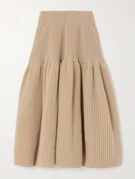 Dieser Rock von Dries Van Noten stammt aus der H/W 25-Kollektion, die Kreativdirektor Julian Klausner als eine Hommage an Transformation beschreibt. Das fließende Rippstrickmodell aus Wolle hat einen eng anliegenden, hohen Bund und Teilungsnähte. Orientieren Sie sich beim Styling am Laufsteg und tragen Sie zum Betonen der Midilänge Stiefel dazu.