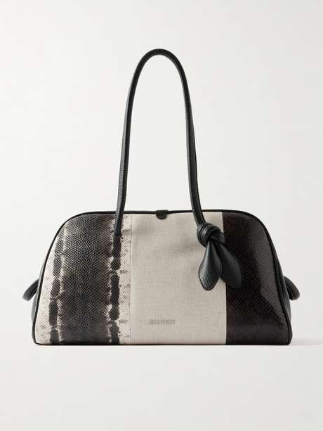 Die unverstärkte „The Turismo“ Tote von Jacquemus erinnert an klassische Bowling-Varianten. Das in Italien gefertigte Accessoire aus Leder mit Schlangeneffekt sowie Canvas hat eine leicht abgerundete Form und an einer Henkelseite einen kunstvollen Knoten. Das kompakte Innere bietet ausreichend Platz für Smartphone, Kartenetui und Schlüssel.