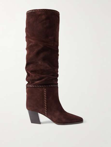 Die kniehohen „Hart“ Stiefel von Jimmy Choo wurden mit Details im Überwendlichstich versehen, die für Bohème-Flair sorgen. Das Paar aus weichem Veloursleder hat einen unverstärkten Schaft und einen eckigen, 60 Millimeter hohen Blockabsatz.