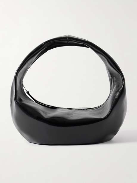 Die unverstärkte „Olivia“ Tote von KHAITE hat eine runde Form, die in einen unstrukturierten Henkel an der Oberseite übergeht. Das in Italien gefertigte Accessoire aus Lackleder in Knitteroptik kann sowohl in der Armbeuge als auch über der Schulter getragen werden und bietet ausreichend Platz für Smartphone, Portemonnaie und Schlüssel.