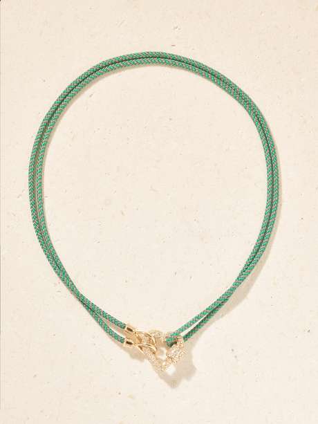 Marla Aaron's necklace is inspired by love locks as a symbol of everlasting connection. Slung from cord, it's tipped with a 14-karat gold charm that glistens brightly with diamonds.