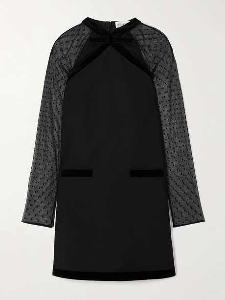 Dieses Minikleid von Nina Ricci ist ideal für Abendveranstaltungen. Es besteht aus Wollgabardine, wobei für die Ärmel gepunkteter Tüll gewählt wurde. Zu guter Letzt sorgen eine Schleife am Ausschnitt und Samtbesätze für eine edle Note.