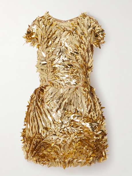 Dieses Kleid von Oscar De La Renta stiehlt allen die Show. Es ist über und über mit federförmigen Pailletten und Kristallen bedeckt, die jeden auch noch so kleinen Strahl einfallenden Lichts reflektieren. Das Modell wurde aus durchscheinendem Mesh gefertigt und mit eng anliegendem Oberteil gestaltet, das von der Hüfte an in einen ausgestellten Rock übergeht. Tragen Sie passende goldene High Heels dazu.
