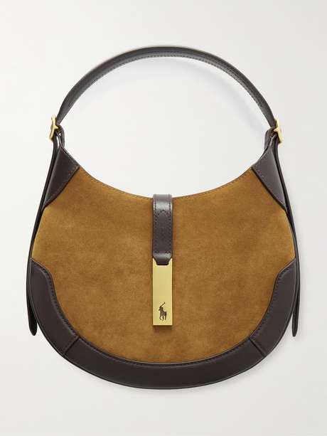 Die Taschen der „Polo ID“ Kollektion von Polo Ralph Lauren sind in Anspielung auf den Reitsport allesamt sattelförmig gestaltet sowie mit ausgeschnittenen „ID“-Tags versehen. Dieses Modell aus Veloursleder wurde mit Besätzen aus Leder verstärkt und mit einem verstellbaren Henkel ausgestattet. Das Innere bietet ausreichend Platz für Portemonnaie, Tablet sowie Schlüssel.
