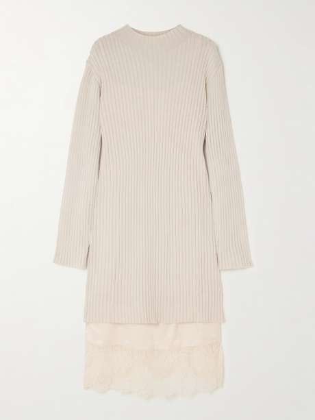 Das „Willow“ Midikleid von STAUD wirkt wie ein mehrlagiges Outfit. Es wurde aus einer Wollmischung in Rippstrick gefertigt und am Abschluss mit einer Partie aus spitzenbesetztem Satin unterlegt. Tragen Sie kniehohe Stiefel dazu.