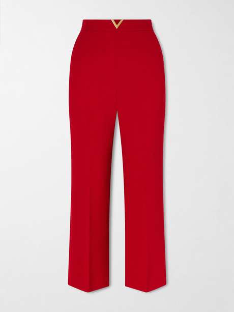 Diese Hose von Valentino Garavani hat eine Einkerbung am Bund, die mit einem goldfarbenen V-Detail im Stil der Marke verziert wurde. Das Wollmodell zeichnet sich durch ein gerades Bein mit Bügelfalten aus und wird von uns mit Mary-Jane-Ballerinas sowie einer eingesteckten Bluse kombiniert.