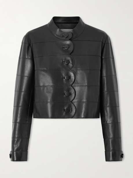 Die „Rory“ Jacke von Veronica de Piante versprüht dank der Wellenkanten entlang der Knopfleiste ein subtil-romantisches Flair. Sie wurde aus geschmeidigem schwarzem Leder gefertigt und in leicht lockerer Passform gestaltet.