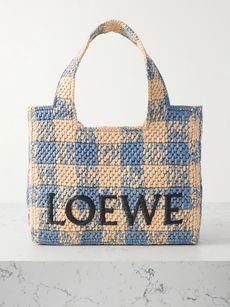 LOEWE+ Paula‘s Ibiza Tote aus Raffiabast mit Karomuster und Stickerei