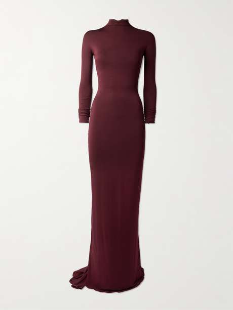 Diese Robe von Alaïa verströmt schlichtes, elegantes Flair. Das Modell mit Stehkragen besteht aus weichem Jersey, der den Körper umspielt, und hat eine fließende Meerjungfrauensilhouette. Dezente Accessoires unterstreichen den minimalistischen Look.