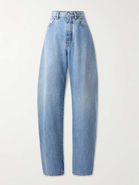 Selbst die Jeans von Alaïa wirken skulptural. Dieses Modell hat ein kunstvolles Barrell-Bein, das schmal zuläuft – Kurven sind ein wiederkehrendes Motiv in den letzten Kollektionen der Marke. Die „Cloudy Blue“-Waschung sorgt für einen dezenten Vintage-Look.