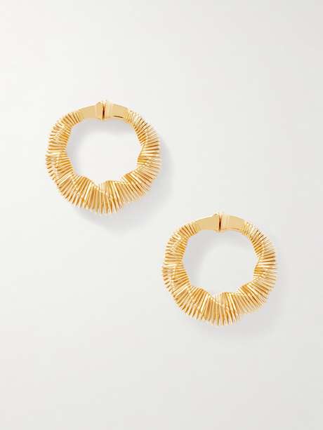 Diese Creolen von Alaïa sind einen genaueren Blick aus nächster Nähe wert. Das Modell aus goldfarbenem Messing hat eine gitterartige, gewundene Spiralform und glänzt dabei besonders schön.