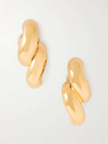 Bei diesen Retro-Ohrclips von Alaïa schmiegen sich zwei goldfarbene Rundelemente aus Metall formschön aneinander. Das Modell verfügt über einen Clipverschluss, der sich auch angenehm trägt.