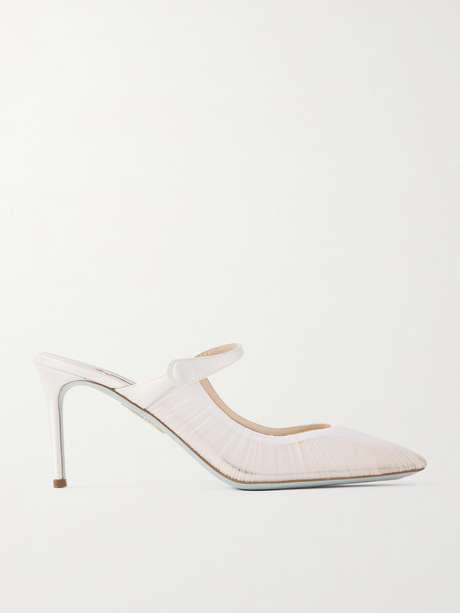 Diese Pumps von Aquazzura bestehen aus zartem Tüll mit dezentem Plissee. Das Modell mit spitzer Kappe wurde zudem mit einem schmalen Riemen aus Satin, der für mehr Halt sorgt, und mit einem Absatz von 75 Millimetern Höhe versehen, auf dem Sie abends durch Ihre Hochzeit tanzen können.