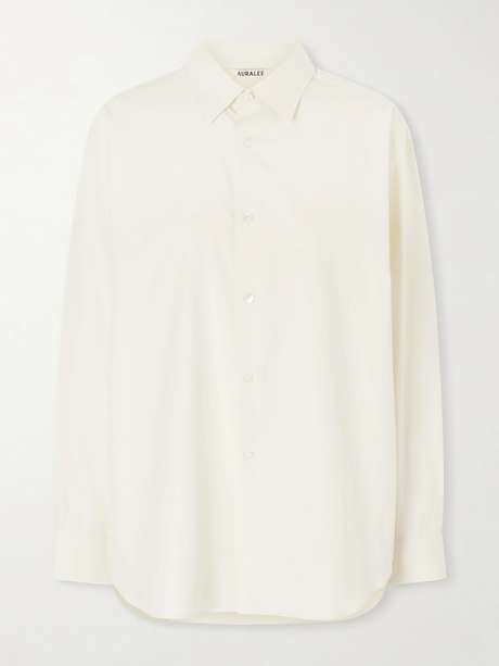 Dieses Hemd von Auralee wirkt besonders zeitlos schlicht, was die japanische Marke mit ihrer Designphilosophie auch beim Entwerfen ihrer anderen Kreationen aufgreift. Das Modell aus festem ägyptischem Finx-Baumwoll-Twill ist recht locker geschnitten und lässt sich gut mit einer Anzughose kombinieren.