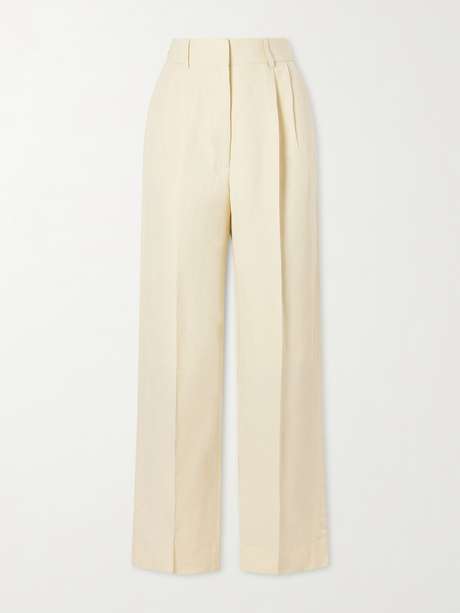 Die „Savannah Fox“ Hose von BLAZÉ Milano ergibt in Kombination mit dem passenden Blazer einen schicken Anzug für den Sommer. Das hoch sitzende Modell aus einer Leinen-Seidenmischung hat ein gerades Bein mit smarten Bügelfalten. Goldschmuck harmoniert perfekt mit dem „Butter“-Pastellgelbton.