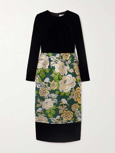 Dieses Midikleid von Carolina Herrera erschien auf dem H/W 25-Laufsteg – die Show fand im 48. Stock des Solow Building mit Blick auf den New Yorker Central Park statt. Aufgrund des Oberteils aus Samt sowie des eng anliegenden Rocks aus glänzendem Metallic-Jacquard mit Blumenmuster wirkt das Modell wie ein Zweiteiler.