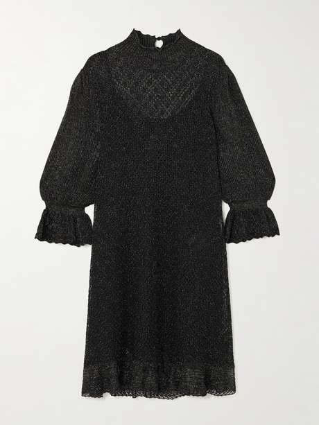 Bei näherer Betrachtung erkennen Sie, dass dieses Kleid von Chloé aus zartem spitzenartigem Strick besteht. Das leicht durchscheinende Modell mit Raffungen an Kragen und Ärmelabschlüssen ist, da es aus schimmerndem Metallic-Garn besteht, perfekt für die festliche Jahreszeit.